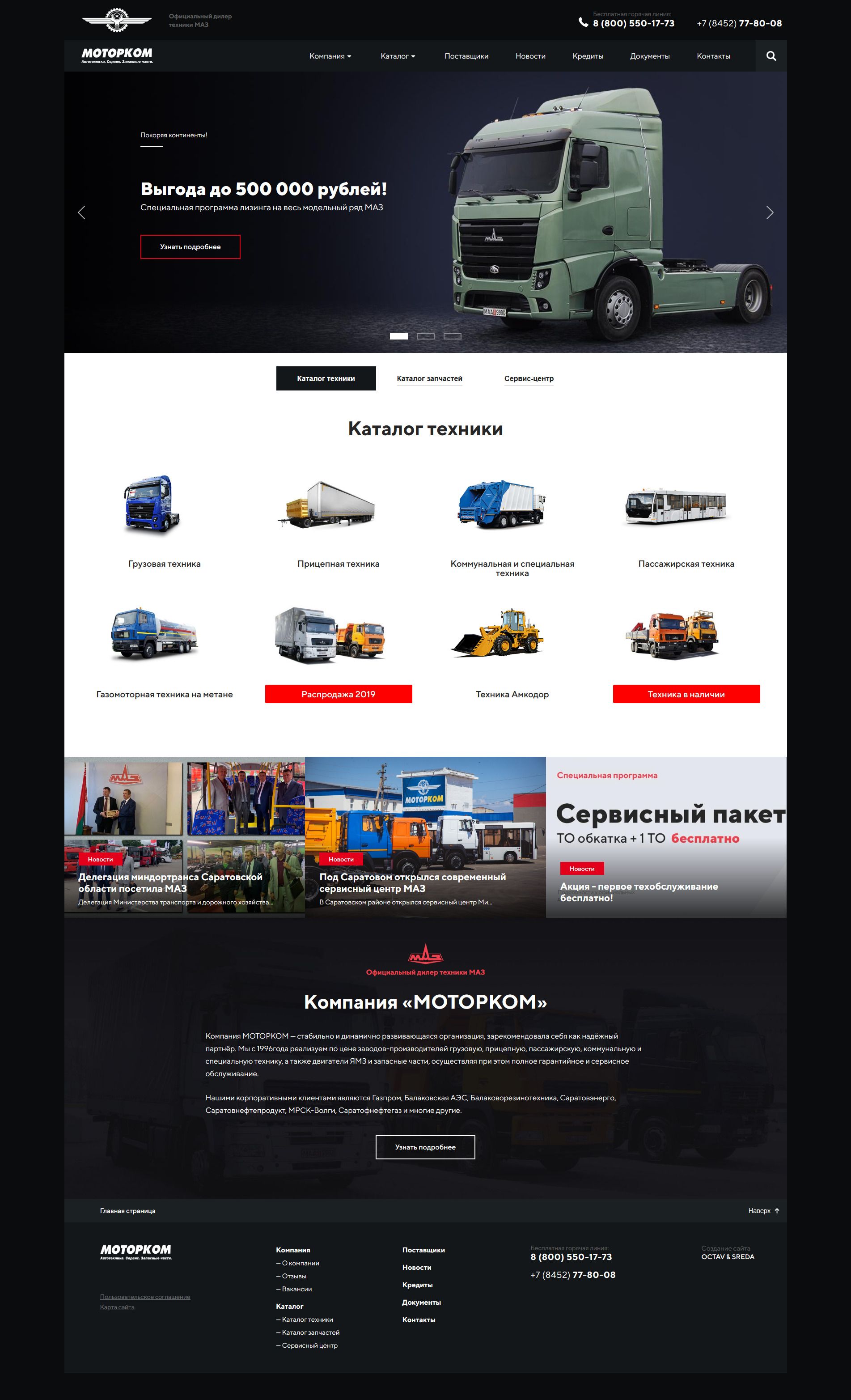 Для компании "Моторком", официального дилера МАЗ в Саратовской области, мы разработали корпоративный сайт с индивидуальным дизайном, каталогом продукции и информационными материалами, а затем интегрировали с CRM Bitrix24